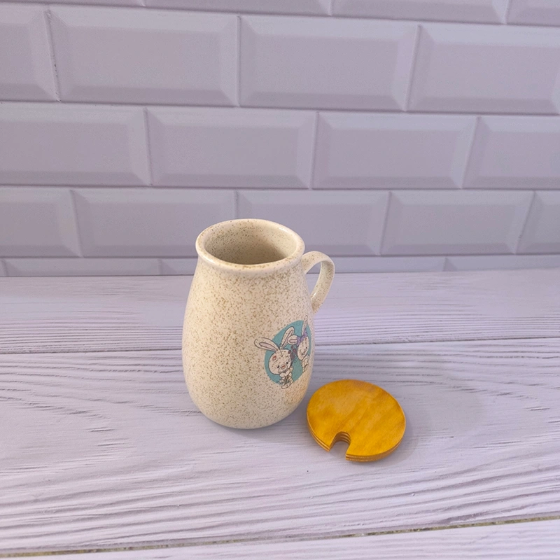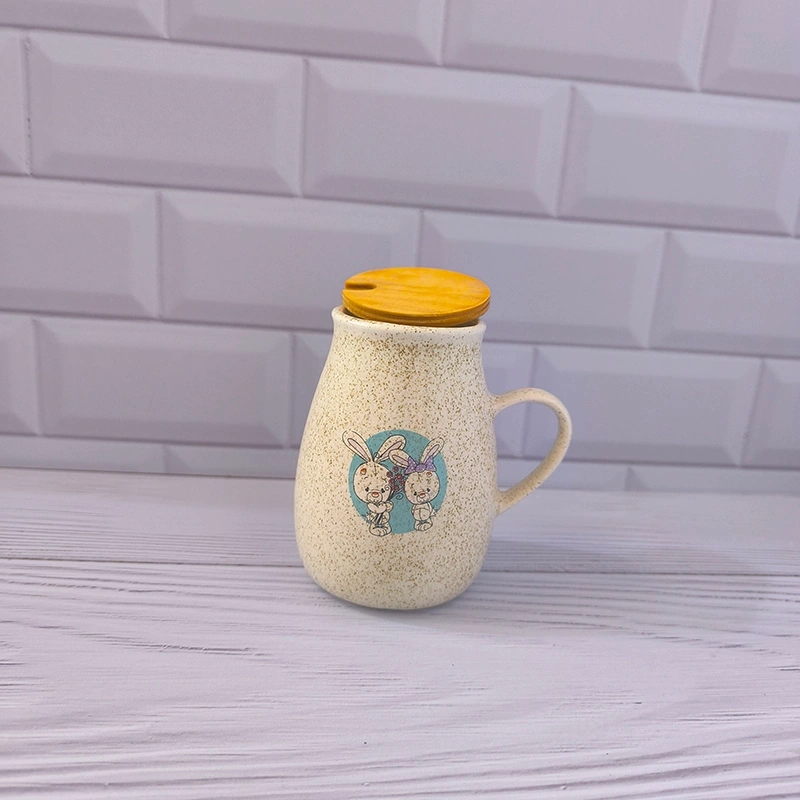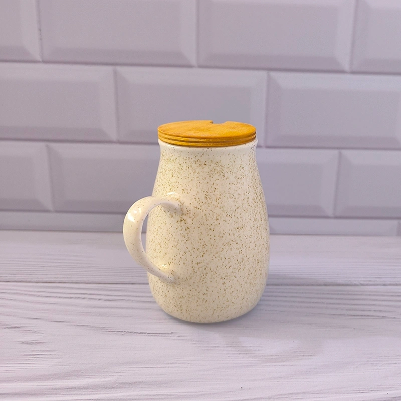ماگ سرامیکی وارداتی با درب چوبی بامبو | ماگ 370 میلیلیتر مناسب نوشیدنی گرم و سرد