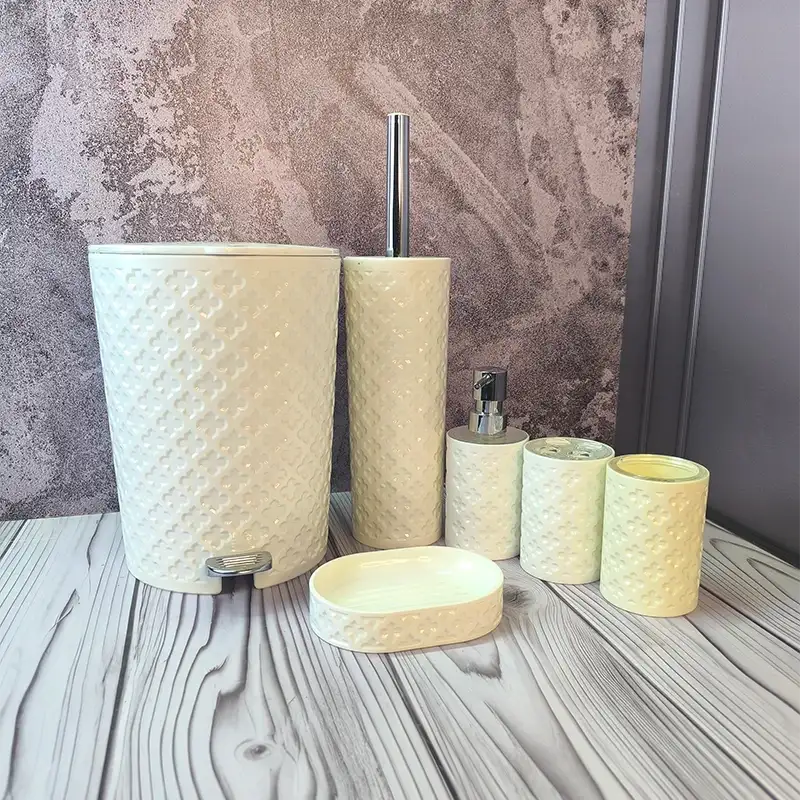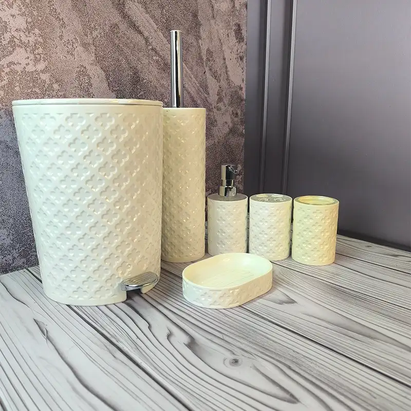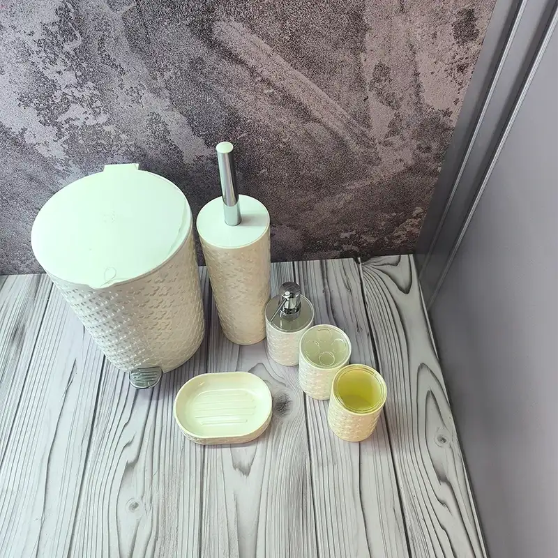 - ست کامل ۶ تکه — شامل سطل زباله، فرچه توالت، جا مایع (مایع دستشویی یا شامپو)، جامسواکی، جاصابونی و جا دستمال.