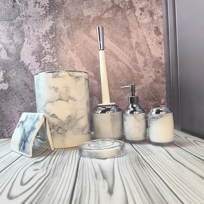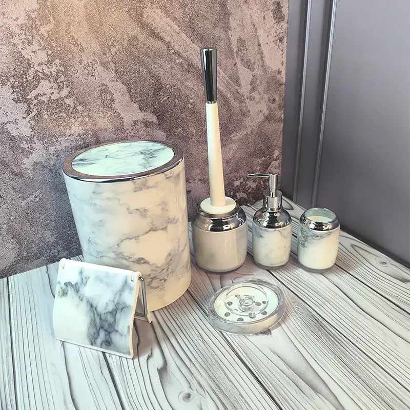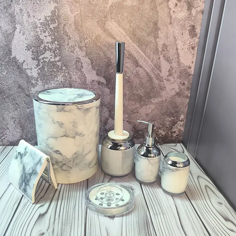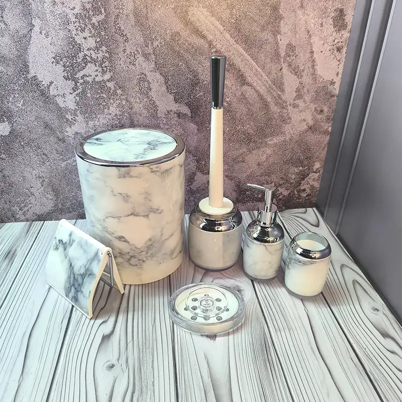 - ست کامل ۶ تکه — شامل سطل زباله، فرچه توالت، جا مایع (مایع دستشویی یا شامپو)، جامسواکی، جاصابونی و جا دستمال.